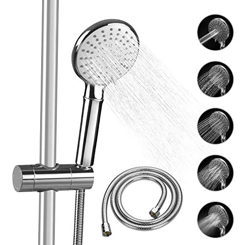 [5 modelli di spruzzo d'acqua] Questo kit soffione doccia cromato con design ad alta pressione, offre 5 opzioni di flusso d'acqua, pioggia elettrica, massaggi, colonna d'acqua, pioggia e colonna d'acqua, pioggia e massaggio. Il quadrante a scatto rende facile scegliere il tuo umore preferito e goderti appieno ogni esperienza di doccia
