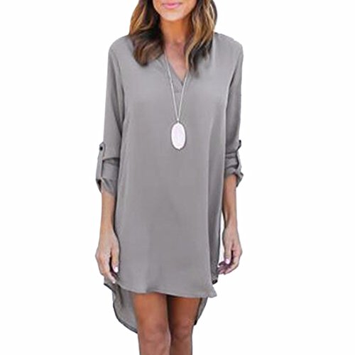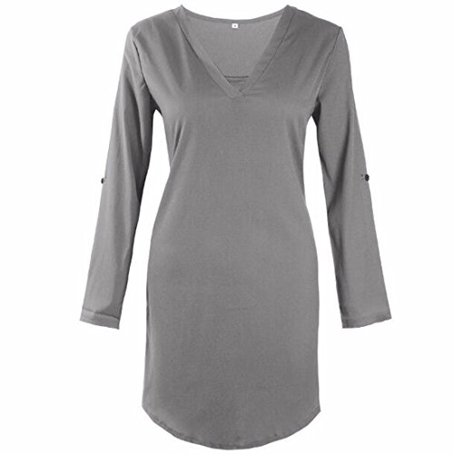 QIYUN.Z Donna V-Collo Roll-up a maniche lunghe Tunica Top camicetta irregolare orlo semplice Camicia di base XL Grigio