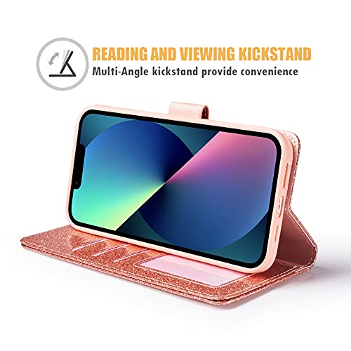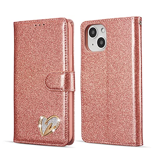 QLTYPRI Custodia a portafoglio per iPhone 14 Plus, in pelle PU glitterata TPU bumper porta carte cavalletto cinturino da polso intarsiato cuore diamante flip cover per iPhone 14 Plus - oro rosa