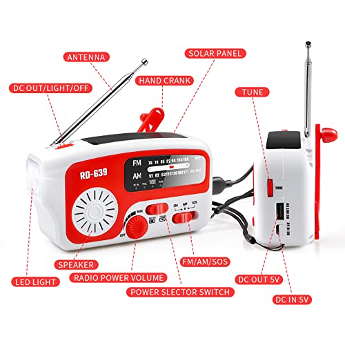【DESIGN INTELLIGENTE】 Batteria agli ioni di litio incorporata da 1200 mAh, la radio a manovella solare può caricare l'emergenza dello smartphone, le funzioni di illuminazione più potenti. Inoltre, l'antenna esterna, l'etichetta elettrica, la comoda manovella, l'interruttore del rubinetto si adattano