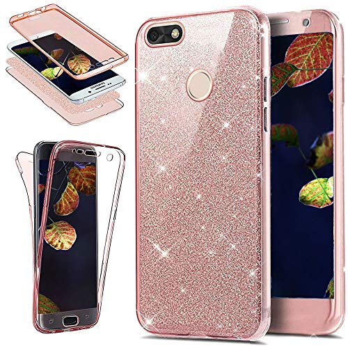 QPOLLY Cover Compatibile con Huawei Y6 Pro 2017 Trasparente 360 Gradi Silicone Morbido Custodia Glitter Brillantini Cover Ultra Sottile Totale Davanti e Dietro Gel Custodia,Rosa