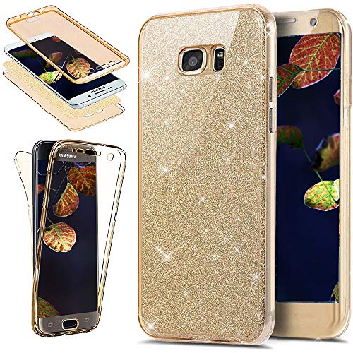 QPOLLY Cover Compatibile con Samsung Galaxy S6 Edge Plus Trasparente 360 Gradi Silicone Morbido Custodia Glitter Brillantini Cover Ultra Sottile Totale Davanti e Dietro Gel Custodia,Oro