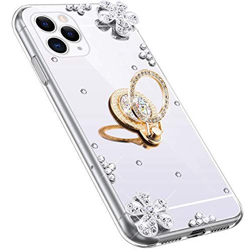 QPOLLY Cover Specchio Compatibile con iPhone 11 con Anello, Brillantini Bling Glitter Fiori Strass Diamante Design Slim Morbido Silicone TPU Gel Gomma Bumper Protettiva Custodia,Argento