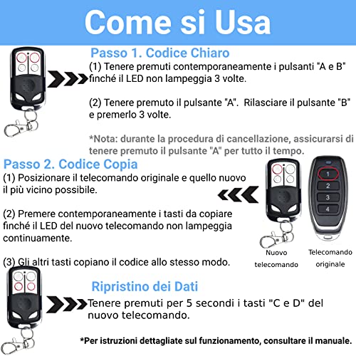 Compatibilità -- Non è universale al 100%. Questo telecomando copia solo l'apprendimento a 433,92 MHz o il codice fisso. NON funziona per le altre frequenze. NON funziona per i telecomandi con codice rolling o altri tipi di codifica.