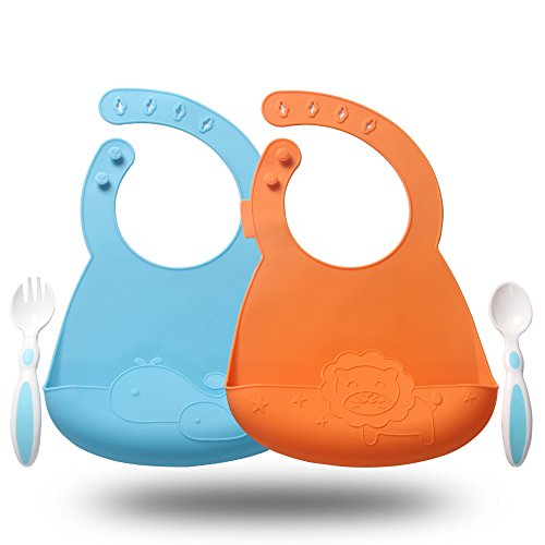 Qshare, set di 2 bavaglini impermeabili con forchetta e cucchiaio, in silicone 100 % alimentare, facili da pulire e comodi da indossare, senza BPA, perfetto regalo per bambini, set