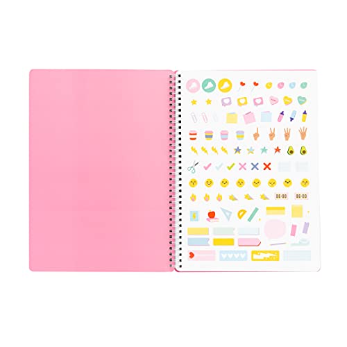160 pagine a quadretti, rilegatura a spirale e 1 foglio di adesivi.