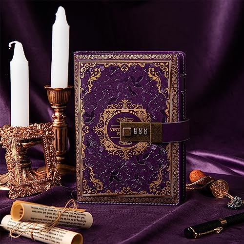 Quaderno vintage in pelle con lucchetto a combinazione, motivo floreale in rilievo B6, con diario segreto a righe, per scrittura, regalo per donne ragazze e bambini (viola)