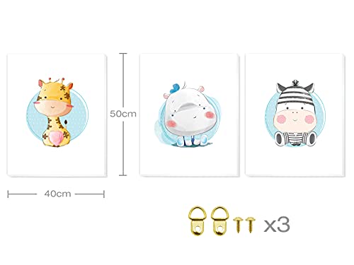 Set di 3 quadri con cornice decorativa in tela stampata per bambini, per decorare le pareti della camera da letto dei bambini, con telaio in legno, 3 quadri dimensioni 40 x 50 cm (Animali blu).