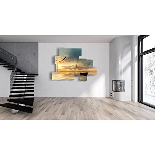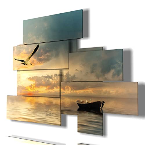 quadro mare barca e gabbiano al tramonto é un quadro moderno tridimensionale composto da 10 pannelli. Dimensione totale (LxHxS): 171cm x 124 cm x 5.6 cm. (4 verticali 6 orizzontali)
