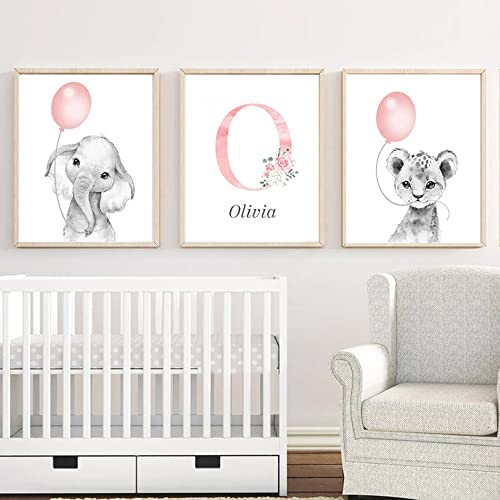 3 Quadro Nome Bambino Elefante Leone con Palloncino Tela Camera da Letto Bimba Poster Neonato Nascita Grigio e Rosa A3 Stampe Personalizzato Decorazione da Parete Regalo senza Cornice