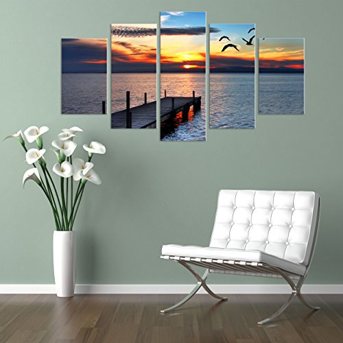 QUADRO SU TELA CANVAS - INTELAIATO - PRONTO DA APPENDERE - Tramonto sul mare - Pontile Attracco Barche - 170x86cm (cod.1425)