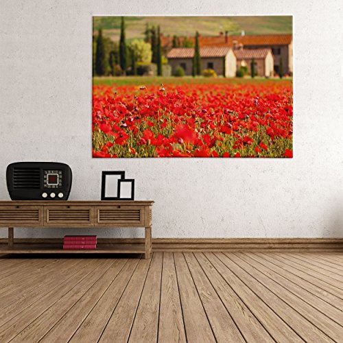QUADRO SU TELA CANVAS - INTELAIATO - PRONTO DA APPENDERE - Papaveri rossi e casolare in Toscana - 30x40cm - Senza Cornice - (cod.2780)