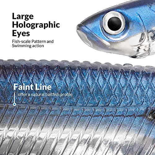 2. Dettagli realistici: questo pesce di gomma con dettagli ultra realistici, i pesci bersaglio non potranno ignorarlo. Il pesce di gomma include un motivo a squame di pesce molto dettagliato, una piastra branchia di pesce e occhi 3D ultra realistici. Con pellicola flash nella pancia per riflettere sott'acqua, cosa che è buono nei giorni in cui hai bisogno di questo flash, attirando più morsi.