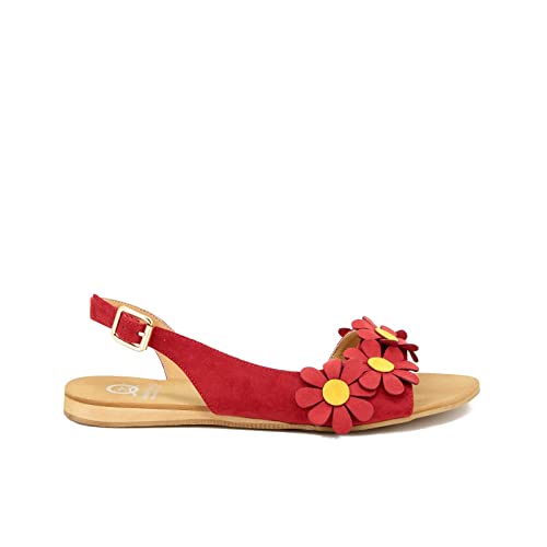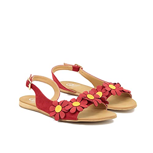 QUEEN HELENA Sandali Bassi con Fiori Piatti Aperti Glamour Casual Cinturino alla Caviglia Donna ZM8037 Rosso 40