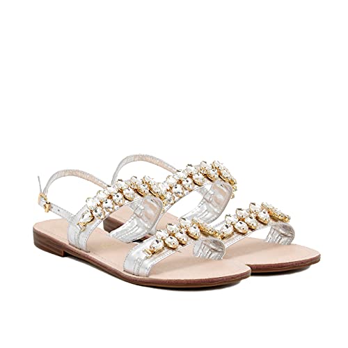 QUEEN HELENA Sandali Gioiello Bassi con Pietre Strass Aperti Casual Donna Y3030 Argento 38