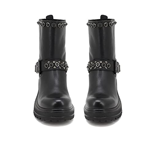 QUEEN HELENA Stivaletti Biker Borchiati di Pelle con Tacco Bassi Casual Invernali con Fibbia Donna S102 Nero 36