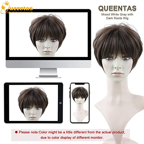 Queentas parrucca donna corta parrucche castano pixie acconciatura con frangia corte capelli sintetici per l'uso quotidiano cosplay (colore:Castano Scuro)