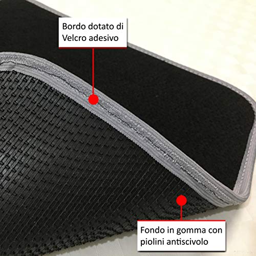 FISSAGGIO: Il kit non necessita di Block, Clip, Fix, Ganci, Tappi o Bottoni in quanto il fondo in gomma è dotato di piolini “ferma tappeti”. Inoltre il bordo in tessuto, saldamente cucito al perimetro dei tappetini, è dotato di velcro che blocca rigidamente i tappeti rendendoli adesivi alla base dell'auto (è comunque possibile richiedere una serie di clips di ancoraggio compatibili con gli originali e/o clips universali)