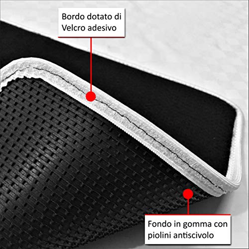 FISSAGGIO: Il kit non necessita di Block, Clip, Fix, Ganci, Tappi o Bottoni in quanto il fondo in gomma è dotato di piolini “ferma tappeti”. Inoltre il bordo in tessuto, saldamente cucito al perimetro dei tappetini, è dotato di velcro che blocca rigidamente i tappeti rendendoli adesivi alla base dell'auto (è comunque possibile richiedere una serie di clips di ancoraggio compatibili con gli originali e/o clips universali)