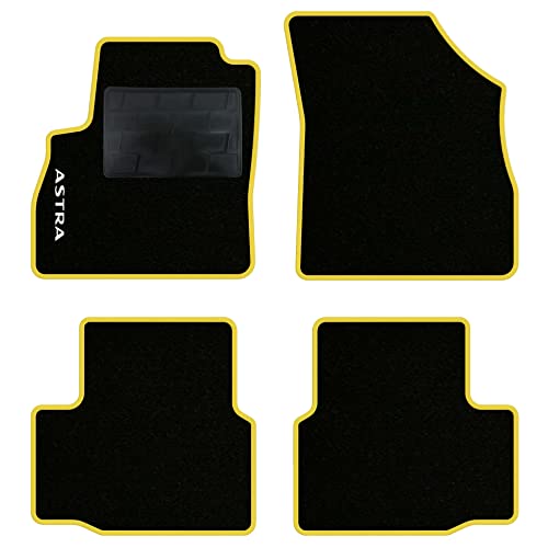 QUEMAR Kit Tappetini Auto compatibili con Opel Astra K 2015-2021 / Set Tappeti in Moquette e Gomma su Misura (2 Anteriori + 2 Posteriori) / Ricami e Colori Personalizzati (1 Ricamo, Bordo Giallo)