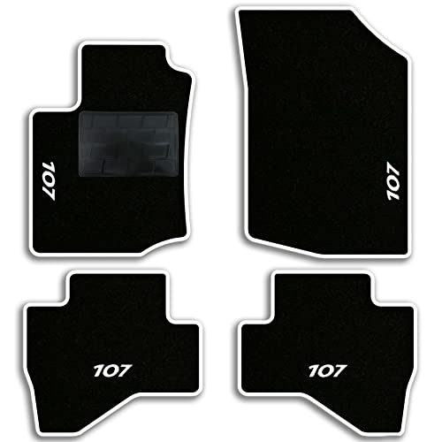 QUEMAR Kit Tappetini Auto compatibili con Peugeot 107 2005-2014 / Set Tappeti in Moquette e Gomma su Misura (2 Anteriori + 2 Posteriori) / Ricami e Colori Personalizzati (4 Ricami, Bordo Bianco)