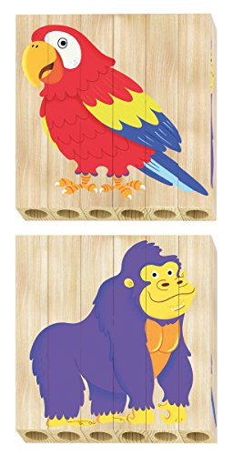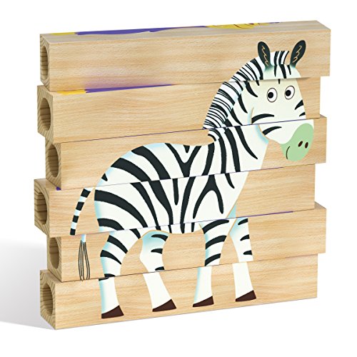 Puzzle composto da grandi barre in legno, con cui comporre 4 diversi animali della jungla, sia in orizzontale che in verticale