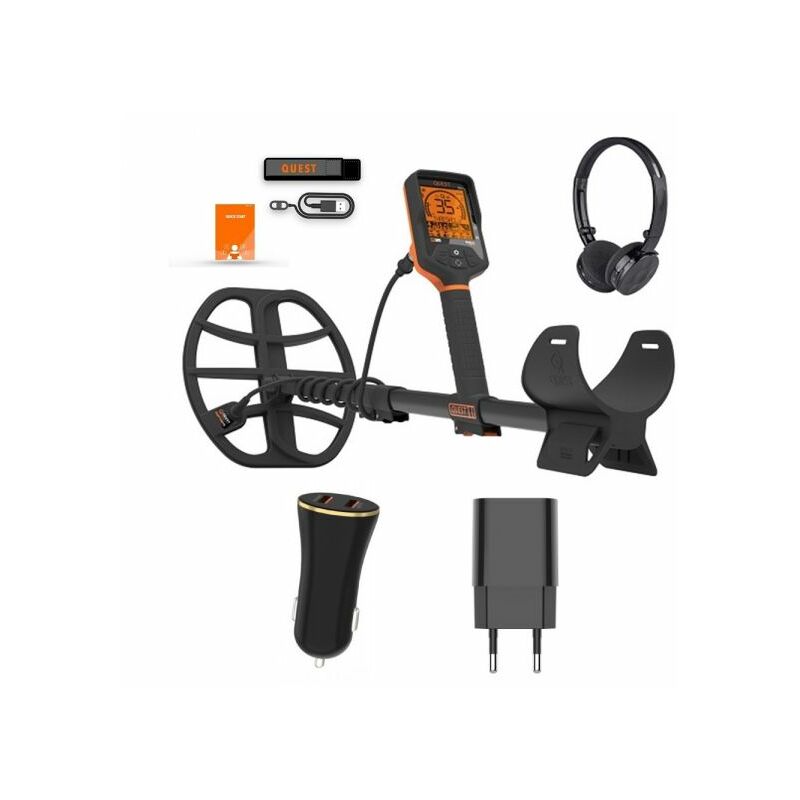 Quest metal detector Q35 3 frequenze di ricerca (Energy pack) Descrizione Il Quest Q35 è dotato di 3 frequenze di ricerca intercambiabili ed è completamente impermeabile fino a una profondità di 5 metri sotto l'acqua. Viene fornito con un modulo radio integrato e cuffie Quest Wirefree Lite senza fili. È dotato di una piastra di ricerca DD Raptor11 da 28 x 26 cm per una maggiore profondità e reattività. Il Q35 è leggero, compatto, ergonomico e molto robusto. La batteria al litio Li-Po integrata da 3000 mAh può essere ricaricata magneticamente e l'illuminazione dell'indicatore arancione completa l'aspetto unico. Frequenze di ricerca intercambiabili Con il Quest Q35 hai anche la possibilità di cambiare la frequenza di ricerca. Ad esempio, se preferisci cercare oggetti più grandi sepolti, è consigliabile impostare il Q35 su 5 kHz. Se stai cercando solo piccoli gioielli o piccoli pepite d'oro, è meglio impostare il Q35 su 21 kHz. Se stai cercando solo monete, è meglio impostarlo su 13 kHz.