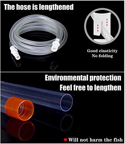 【 Estensione dei tubi di ingresso e uscita dell'acqua 】 2 tubi di ingresso (40 cm + 40 cm) possono essere combinati insieme per eliminare gli avanzi di pesce, gli escrementi e la ghiaia fine, adatti per acquari fino alla profondità di 90 cm. Tubo di scarico ecologico da 207 cm per un drenaggio completo e un uso duraturo.