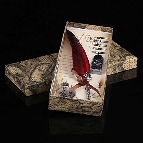 Quill Feather Pet Set di penne piuma vintage intaglio Penna ad immersione con penna d'oca in piuma Penna per scrittura calligrafia per gli studenti ufficiali con 5 pennini(Rosso)
