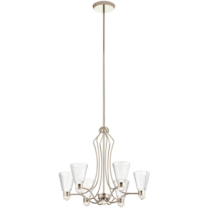 Collezione Kayva MERCATO A PARIGI Lampadario a 13 luci LED e 6 bracci. Ispirata ai decanter in vetro vintage trovati nei mercati delle pulci di Parigi. La serie Kayva, con tecnologia LED dimmerabile incorporata, irradia eleganza francese combinando linee eleganti con vetro sfaccettato trasparente e finitura in nichel lucido per uno stile tradizionale aggiornato. Kayva è classificata IP44 e può essere utilizzata in bagno.