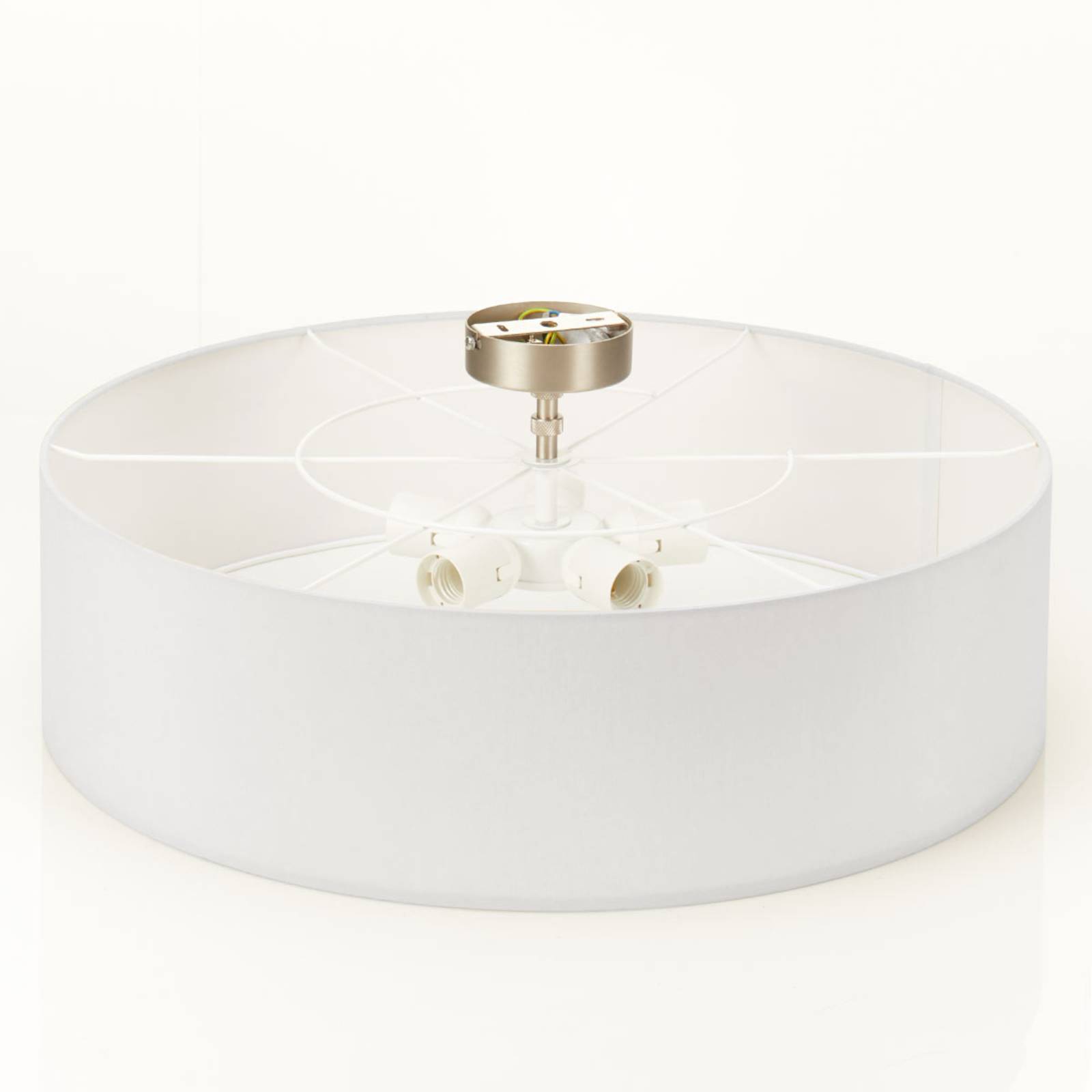 Armonia al massimo: la plafoniera Gala in tessuto bianco con copertura inferiore e forma rotonda - qualità di prima classe made in Germany Un paralume cilindrico bianco in chintz costituisce l'elemento principale della plafoniera Gala, discreta e discreta a sufficienza per essere utilizzata in un'ampia gamma di ambienti. L'apparecchio è prodotto in Germania utilizzando solo componenti di alta qualità, tutti caratterizzati da una qualità di prim'ordine e che insieme garantiscono una fonte di luce di lunga durata. La pellicola di supporto sotto il tessuto chintz bianco di altissima qualità è prodotta in qualità B1 ed è ritardante di fiamma in conformità con questa classe di materiali da costruzione, il che rappresenta naturalmente un'eccezionale caratteristica di sicurezza. Inoltre, il paralume può essere fissato in modo rapido e semplice grazie a uno speciale meccanismo che ne facilita l'aggancio. Il disegno della luce della plafoniera è morbido e uniforme, perché oltre al tessuto bianco del paralume sul lato, viene utilizzato un diffusore, anch'esso in chintz bianco, per conferire alla luce maggiore intimità. Sul lato del soffitto, il paralume è stato montato a una leggera distanza, in modo che una piccola quantità di luce fuoriesca indirettamente e crei un piccolo ma sottile gioco di luci sul soffitto. Gala è dotata di cinque prese per lampadine E27 per fornire una buona illuminazione ambientale nel soggiorno. Un prodotto estetico completo per l'illuminazione del soggiorno, che non mancherà di piacere negli anni a venire!
