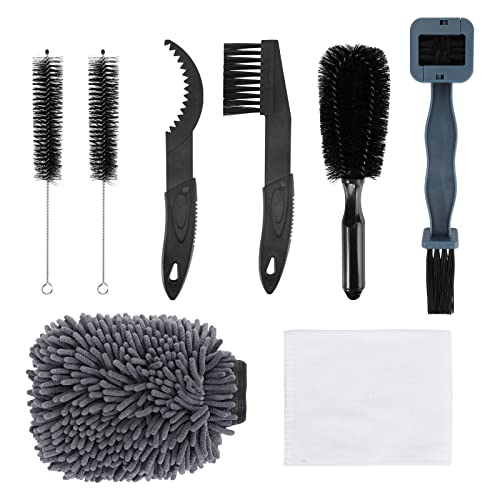 Il Set Include: Guanto per la pulizia della bici, spazzola per la pulizia della catena della bici, raschietto per la pulizia del pignone da 2 pezzi, spazzola per la pulizia dei pneumatici, spazzola per la pulizia del pignone, spazzola per i dettagli, asciugamano.