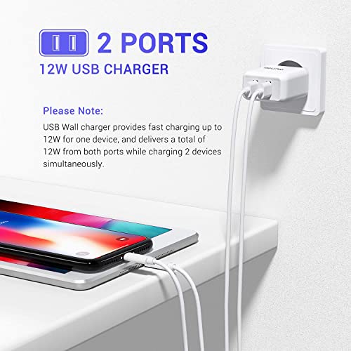 [2 Port 12W Caricatore iPhone+2 Pezzi 2m Cavo iPhone] L'uscita totale di questo Caricatore USB a 2 porte è 12W (5V 2,4A). Ciò significa che se utilizzi solo una porta USB per caricare l'iPhone, quella singola porta USB avrà una potenza di 12 W. Rispetto al Caricabatterie USB originale da 5 W, il tempo per una ricarica totale si riduce di circa 30 minuti. Se due porte USB vengono utilizzate per caricare due dispositivi contemporaneamente, ciascuna porta USB può fornire un massimo di 6 W