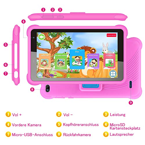 QunyiCO Y7 Tablet da 7 pollici per bambini, 1024 x 600 Full HD Display 10.0 Android GO, 2 GB di RAM, 32 ROM, app IWAWA con certificazione GGMS la sicurezza dei bambini ora e contenuti, rosa
