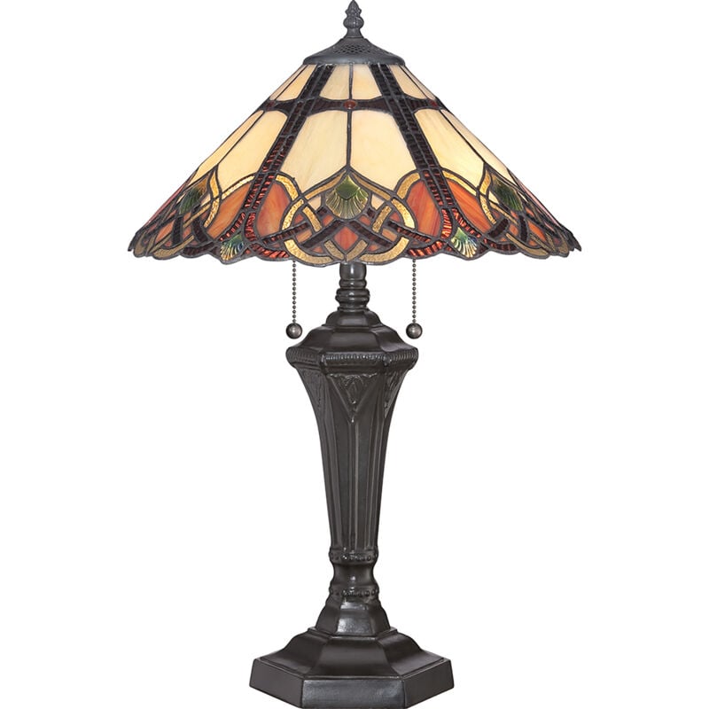 Collezione Cambridge FASCINO NEW ENGLAND Lampada da tavolo a 2 luci. Lo stile Tiffany è classico e senza tempo, proprio come il design della Collezione Cambridge. È caratterizzato da una splendida tavolozza di colori: beige crema, arancioni bruciati e sottili accenni di verde tenue in un motivo Art Nouveau. La ricca finitura Vintage Bronze completa il look.