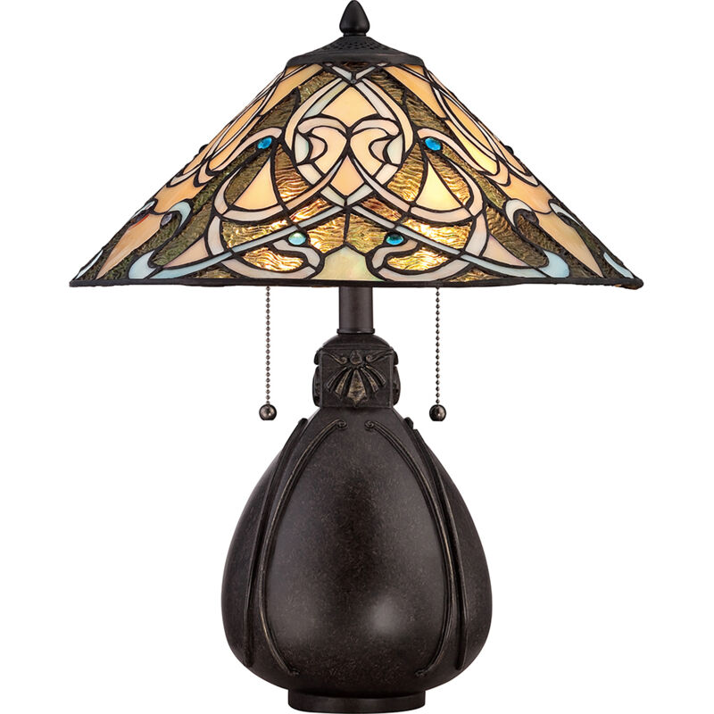 Collezione India LAMPADA COMPATTA Lampada da tavolo a 2 luci. India è una lampada da tavolo Tiffany più compatta, che presenta un bellissimo disegno intrecciato di vetri color crema e oro con splendidi cristalli blu disseminati sul paralume.