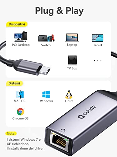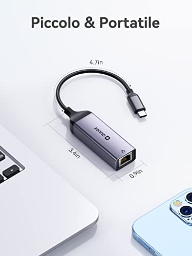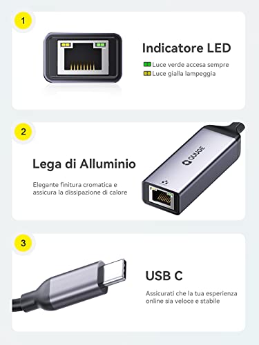 QUUGE Adattatore USB C Ethernet, Thunderbolt 3/4, Type-C a RJ45 Gigabit Ethernet USB 3.0 1000 Mbps Adattatore di Rete in Alluminio, Compatibile con Mac OS Windows Linxu, per MacBook Pro/Air