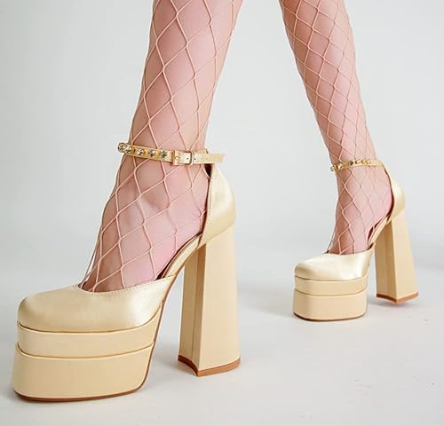 QWEZXCMI Platform Chunky High Block Tacco per Le Donne, 2022 Summer Square Toe Strap della Caviglia Fibbia Strass Strass Abito da Cuneo Pompe delle Pompe,36,Beige