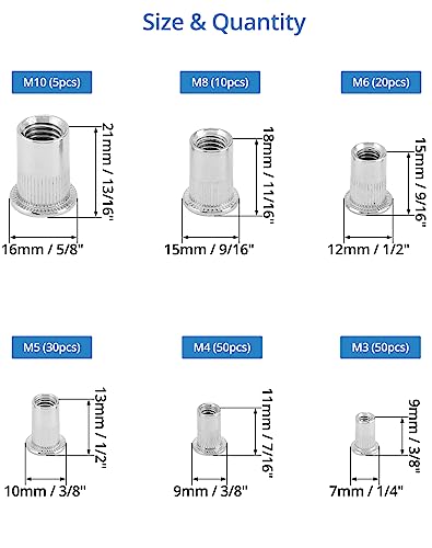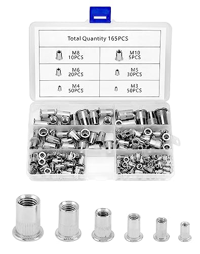 6 diverse misure: 165 dadi per rivetti in acciaio inossidabile, 6 misure: M3 x 50 pezzi, M4 x 50 pezzi, M5 x 30 pezzi, M6 x 20 pezzi, M8 x 10 pezzi, M10 x 5 pezzi Viene fornito in una pratica confezione di cartone.