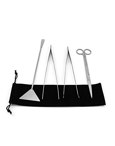 QWORK 4-in-1 Set di Aattrezzi per Acquario, Pinzette Dritte e Curve, Forbici Curva, Spatola, Accessori per Acquario in Acciaio Inox