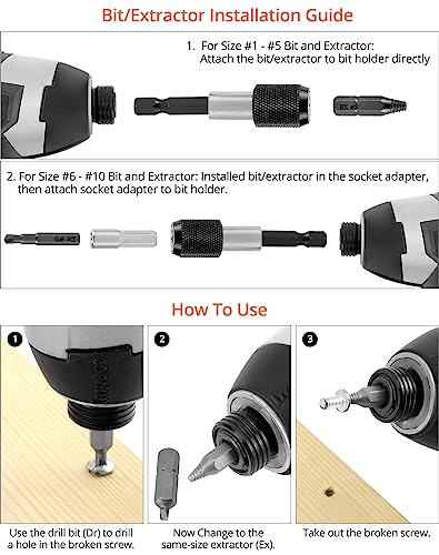 FACILE DA USARE - Scegli il trapano o l'estrattore giusto tra il trapano n. 1-5 o l'estrattore n. 1-5, fissalo direttamente al supporto del trapano e usalo comodamente. Se si utilizza una punta da trapano n. 6-10 o un estrattore, accertarsi di collegarlo prima all'adattatore della presa e poi al portapunte.