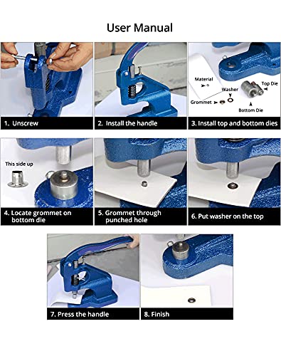 Facile da usare: montato su un tavolo o semplicemente stare da solo. Ottiene gli occhielli per essere impostato ulteriormente nel materiale, non solo lungo il bordo. Premere la leva, semplice da usare come una cucitrice.