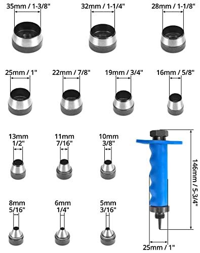 Dimensioni del set di punzoni in pelle: 3/16"(5mm), 1/4"(6mm), 5/16"(8mm), 3/8"(10mm), 7/16"(11mm), 1/2" ( 13mm), 5/8" (16mm), 3/4" (19mm), 7/8" (22mm), 1" (25mm), 1-1 /8" (28mm), 1-1 / 4"( 32mm), 1-3/8" (35mm).