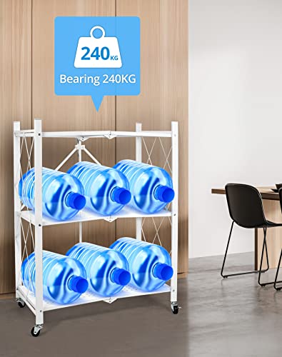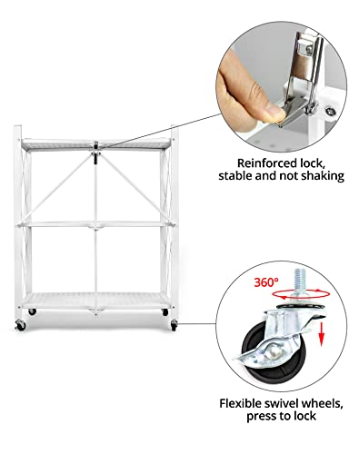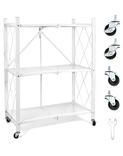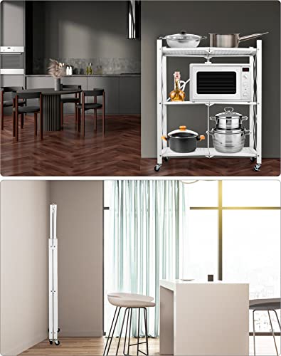QWORK Scaffali In Metallo, Scaffale Cucina, Scaffalatura, Scaffale Con Ruote, Pieghevoli, Non Richiede Installazione, Capacità Di Carico 240 Kg, 3 Ripiani, Bianco