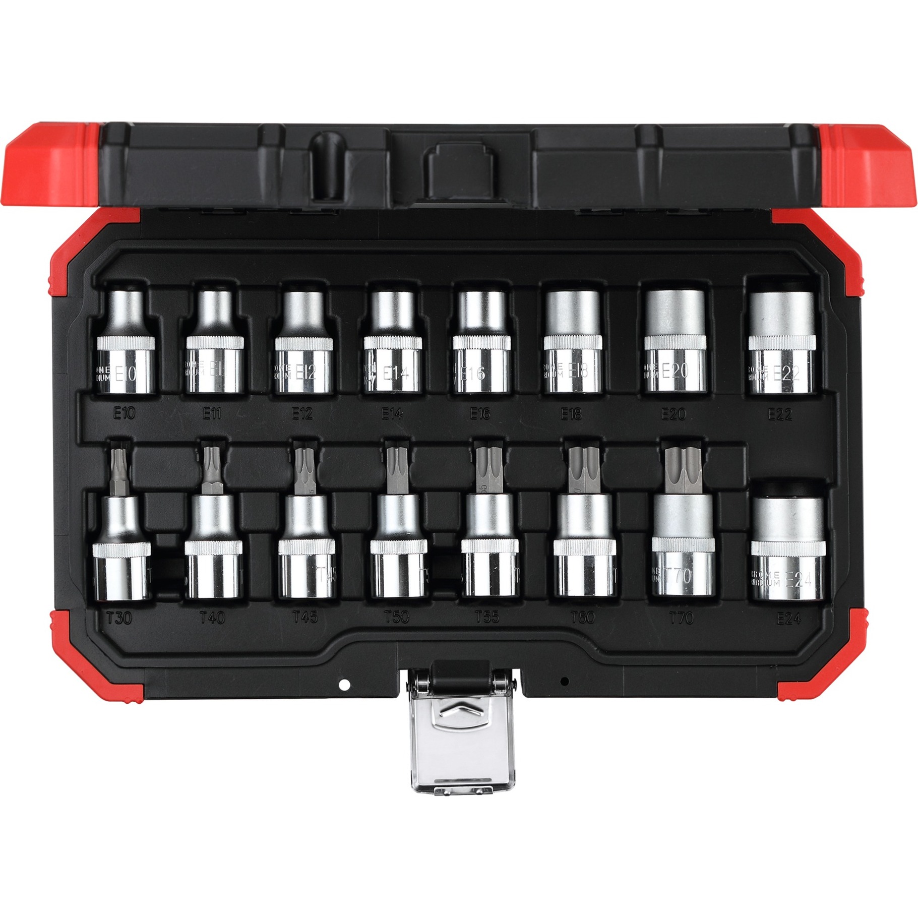 Il set di chiavi a bussola R68003016 in design rosso GEDORE contiene 16 chiavi a serramanico e inserti per cacciaviti con TORX e profilo TORX esterno. È adatto per custodie a vite azionate manualmente. Le chiavi a bussola sono realizzate in acciaio cromato-vanadio e cromato satinato opaco.