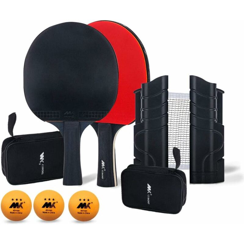 Il set include 2 racchette di alta qualità, 3 palline da ping pong, una rete retrattile e 2 borse portaoggetti, così puoi iniziare subito il tuo gioco senza dover andare altrove. 7 lame e più spesse - Le racchette sono costituite da 7 strati di pioppo, hanno uno spessore di 6,4 mm, rispetto ad altri rastrelli da 5,6 mm e 5 strati, sono più resistenti e forniscono un miglior controllo in attacco e in difesa. La spugna altamente elastica da 2 mm e la gomma biadesiva di alta qualità offrono una rotazione eccellente. Leggera e retrattile, facile da montare: la rete da ping pong è realizzata in cotone poliestere di alta qualità. Può essere stabilmente montato su un tavolo di spessore inferiore a 5 cm. Le clip in plastica possono essere attaccate a qualsiasi superficie, adatte a tutti i tipi di tavoli. Impugnature ergonomiche - Le impugnature presentano un design svasato (più stretto nella parte superiore e più largo nella parte inferiore) che non solo fornisce una presa superiore sulla