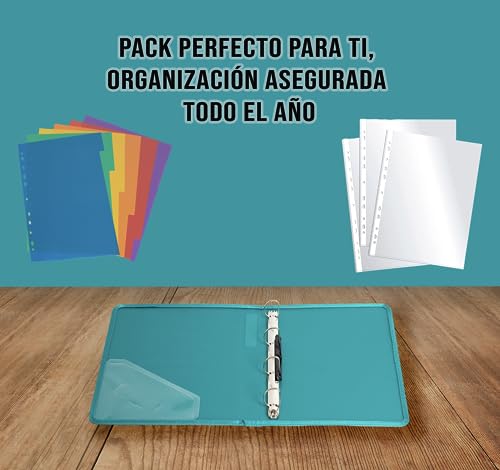 Raccoglitore 4 anelli in plastica include 50 buste in plastica a4 e 6 separatori. Raccoglitore leggero e resistente. Raccoglitore con coperchio semirigido. Cartella per buste e fogli. (Verde)