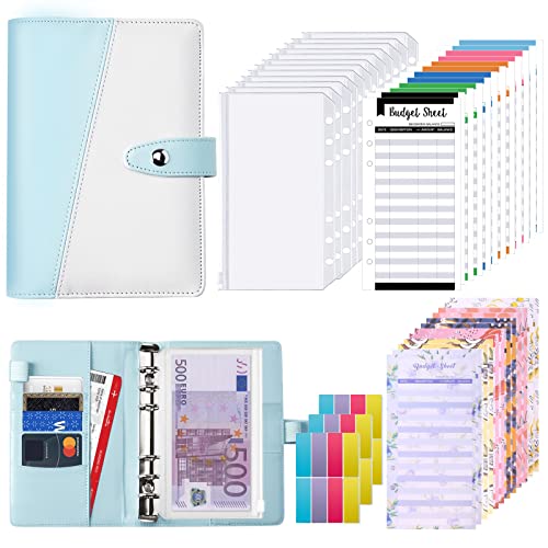 Raccoglitore ad 6 Anelli, Soomeet Raccoglitore con 12 Buste Trasparenti Rimovibile, Raccoglitore Notebook A6, Budget Binder per Risparmio di Denaro per Famiglia Ufficio Scuola (Blu e bianco)