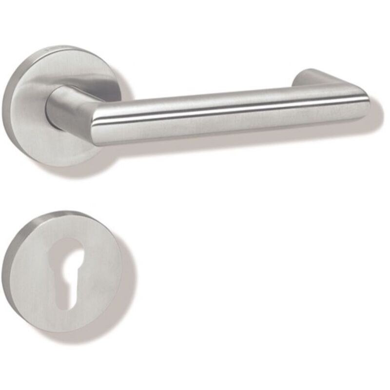 In H-Technik nach DIN 18255 und DIN EN 1906 · aus Edelstahl · Oberfläche matt geschliffen · bestehend aus: Türdrücker 165XAH, Durchmesser 21,3 mm, Rundrosetten 305.21XAH und 306.23XA · mit integriertem Hochhaltemodul mit Federunterstützung · der Drücker erfüllt die Vorgaben der DIN EN 179 · Gebrauchskategorie: Klasse 4 Garnitur mit Vierkantstift 8 - 8,5 mm · Ausführungsvorschlag! Bitte alle Maße und baulichen Gegebenheiten im Auftragsfall prüfen! Weitere technische Eigenschaften: · Drückerlänge: 140mm · Befestigungssystem: verdeckte Verschraubung · Drückertiefe: 62mm · Nockenabstand: 38mm · Farb-Nr.: XA · Norm: DIN 1906