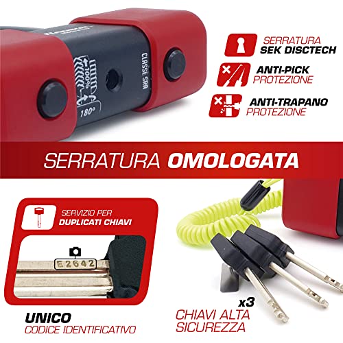 SICUREZZA PREMIUM: Oltre ai suoi materiali di alta qualità, questo blocca disco omologato è protetto da un meccanismo a Doppia Chiusura per resistere agli attacchi di forza. Inoltre, dispone di una serratura SEK DISCTECH ad alta sicurezza con disco antitrapano e protezione antigrimaldello. Le chiavi di sicurezza sono identificate con un codice univoco e possono richiedere duplicati quando necessario.